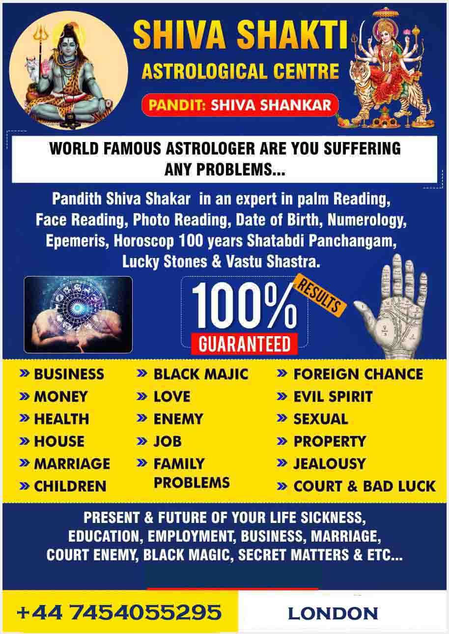 "Astrologer Shiva shankar is a world famous Indian astrologer working in over 5000 years old sphere of Vedic astrology with 300 years of ancestral history. His ancestors have been the finest hand readers of their time and continue to improve, he holds expertise in almost every branch of Vedic astrology. By learning from the source with immense experience, he has become ten times better, and 100 times more confident to work for a flawless human existence. He has learned astrology practices from India and right after that, he has come to London for serving his astrological expertise to people here. Worried about the future of their family, many individuals from the USA have taken Pandith Shiva shanker useful and accurate advice for their important works and problems. With offering a range of services, astrologer Shiva is also a prodigy in performing poojas of different Hindu deities for a prosperous life. He has been an A-grade expert in face reading (physiognomy), palm reading (palmistry), horoscope-reading through Hindu astrology and psychic readings. Demanding more of his services, his clients have been more than satisfied with his ability to pull the roots out of the problems. Consult astrologer Shiva shankar now for answers to your problems. "