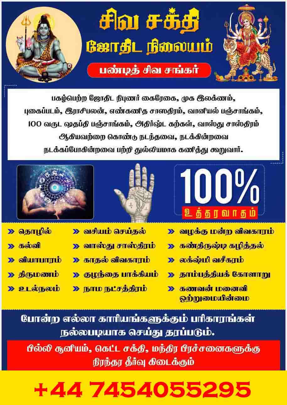 "He has helped lot of people who believes his services.Now he is in UK to help more people and find the solutions those who are in trouble. Pandith Shiva shankar specializes in,numerology,palm reading,photo reading,black magic removal,husband and wife problems, relationship problems, love marriage specialist, financial problems, business problem, childless,health problem, vashikaran,future,past,present,vasthu related problem, horoscope, financial astrology,love astrology. "